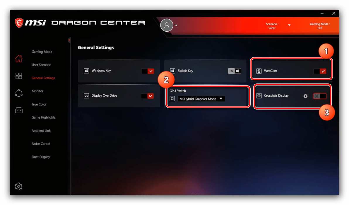 MSI Dragon Center умеет автоматически подбирать сочетание настроек материнской платы и/или установленных на ней системных компонентов для наилучшего игрового опыта — эта функция называется «Gaming Mode». Для её включения перейдите по пути «Домой» — «Gaming Mode» и воспользуйтесь одноимённым переключателем в верхней правой части окна.