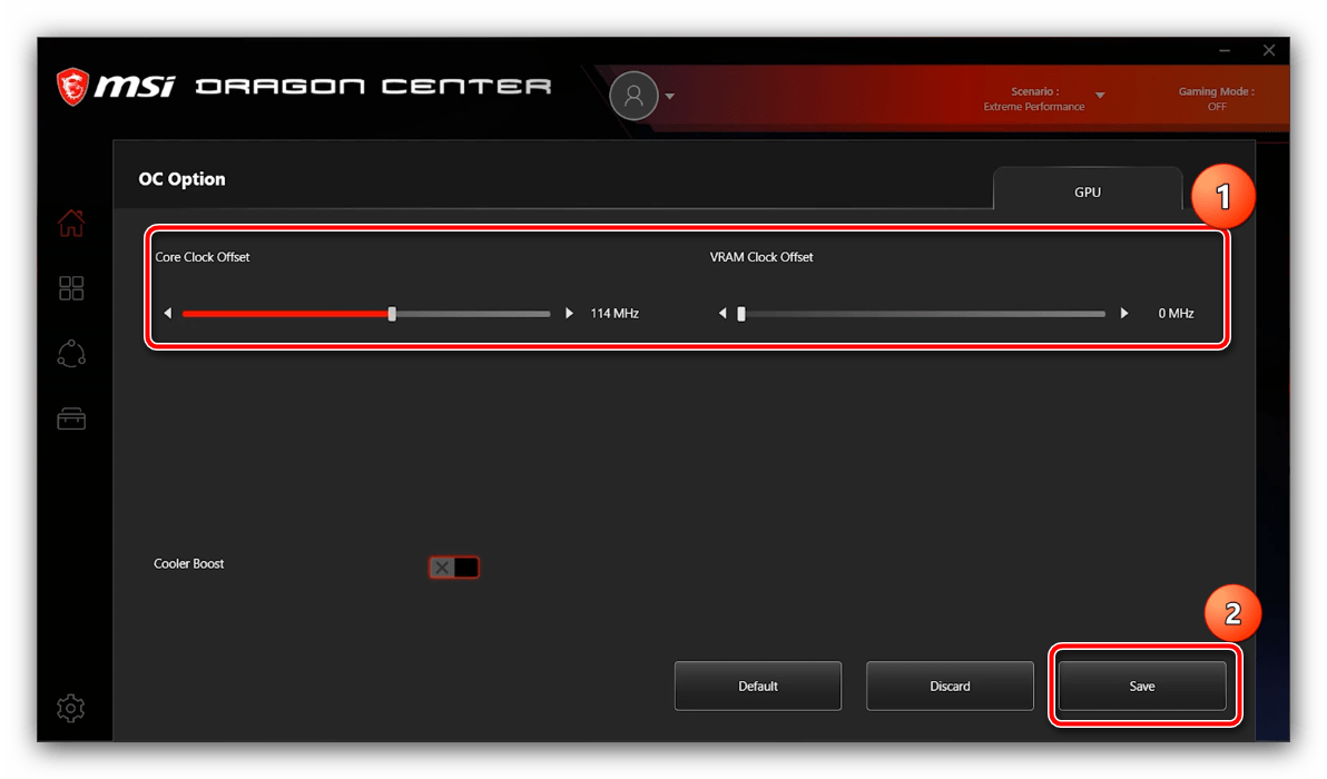 - Вариант «Extreme Performance» предлагает настроить компьютер для оптимального игрового опыта при самых высоких установках графики — он позволяет штатно увеличить рабочую частоту чипсета материнской платы и видеокарты (доступно только для продуктов MSI).