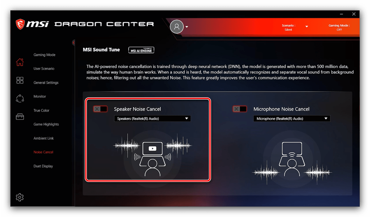 Часть моделей материнских плат MSI для настольных ПК и ноутбуков оборудована встроенной системой шумоподавления, которая работает на нейросетях. Для её включения проделайте следующее: