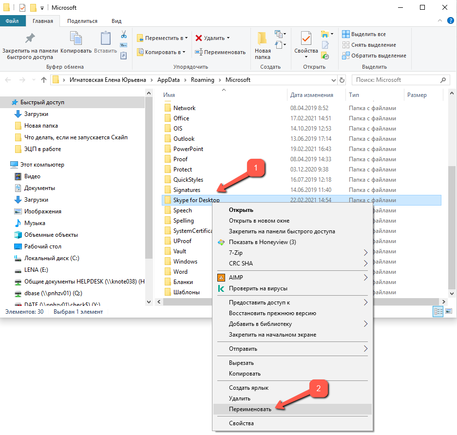Данная команда откроет папку, в которой нужно отыскать папку «Skype for Desktop». Нужно встать на неё мышью, нажать правую кнопку и в меню выбрать команду «Переименовать». Далее нужно присвоить этой папке новое имя, к примеру, добавив к нему цифру: «Skype for Desktop1»