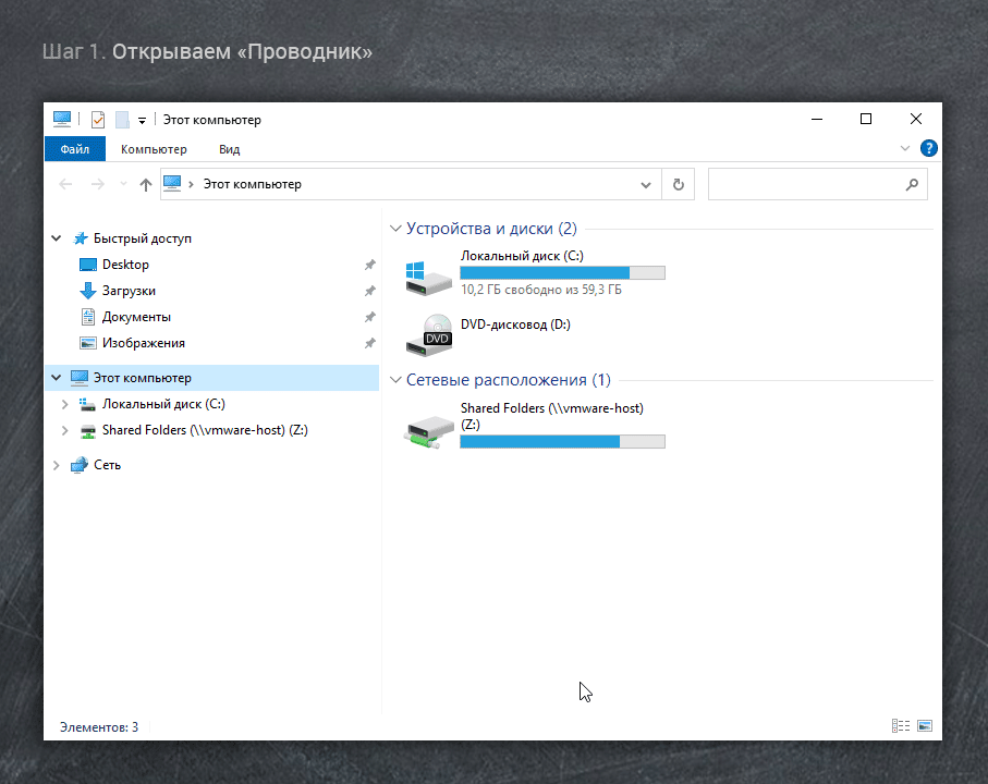 - Запустите Проводник через ярлык «Компьютер» на рабочем столе, с помощью комбинации клавиш + или через ярлык на панели задач.