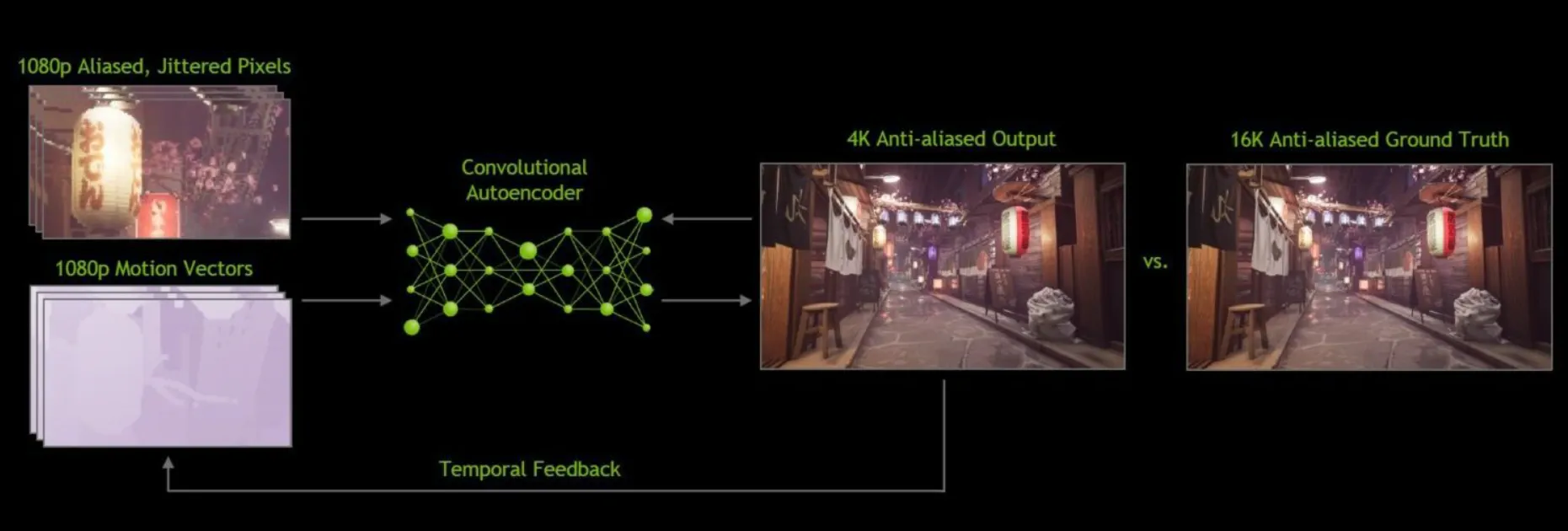 DLSS использует, так называемые, свёрточный автоэнкодер. Это особый тип нейронной сети, которая пиксель за пикселем определяет, какие края и формы нуждаются в коррекции, а какие нет. Во время этого процесса декодер сглаживает и обостряет те детали, которые были отмечены как важные. Это делается путём сравнения кадров низкого и высокого разрешения (текущего и последнего кадра, соответственно).