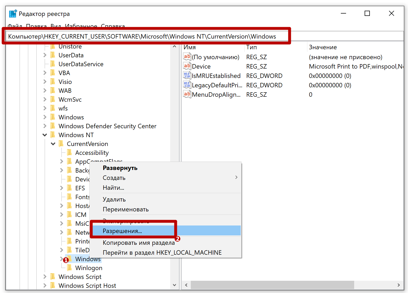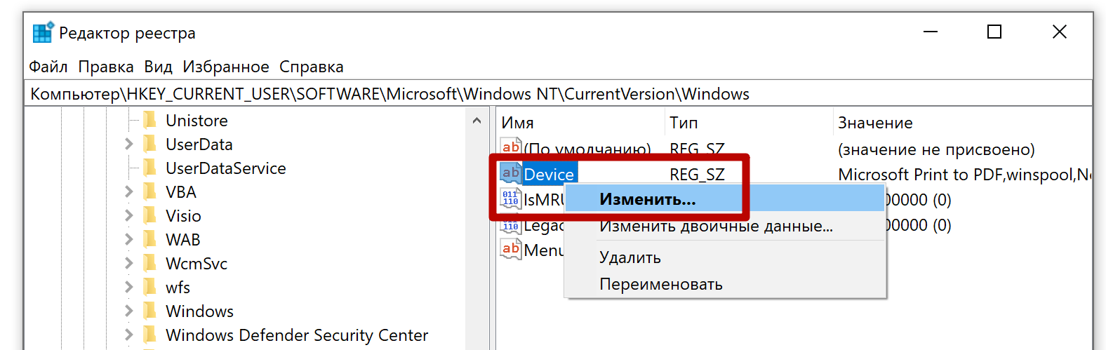 Редактирование реестра Windows