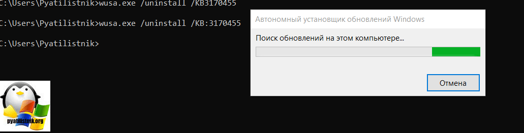 - Введите команду:wusa /uninstall /kb:5005565Затем нажмите Enter.Если проблема возникла с обновлением KB5005568, введите команду:wusa /uninstall /kb:5005568