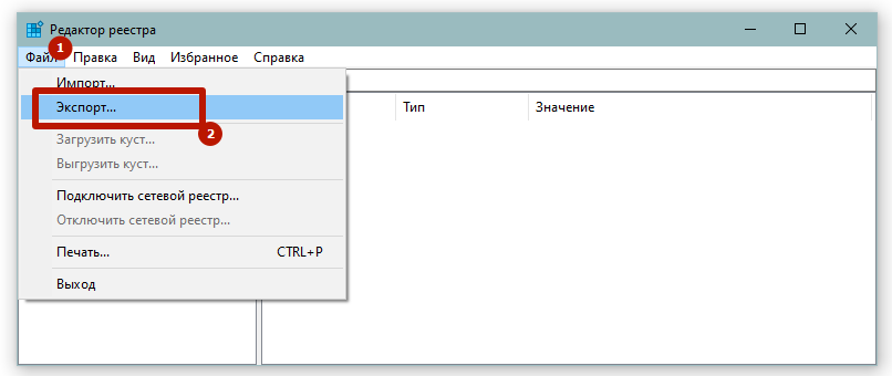 На случай ошибочных действий, чтобы в любой момент вернуть все в исходное состояние, потребуется сделать резервную копию реестра. Для этого выберите пункт «Экспорт» в меню «Файл» открытой оснастки.