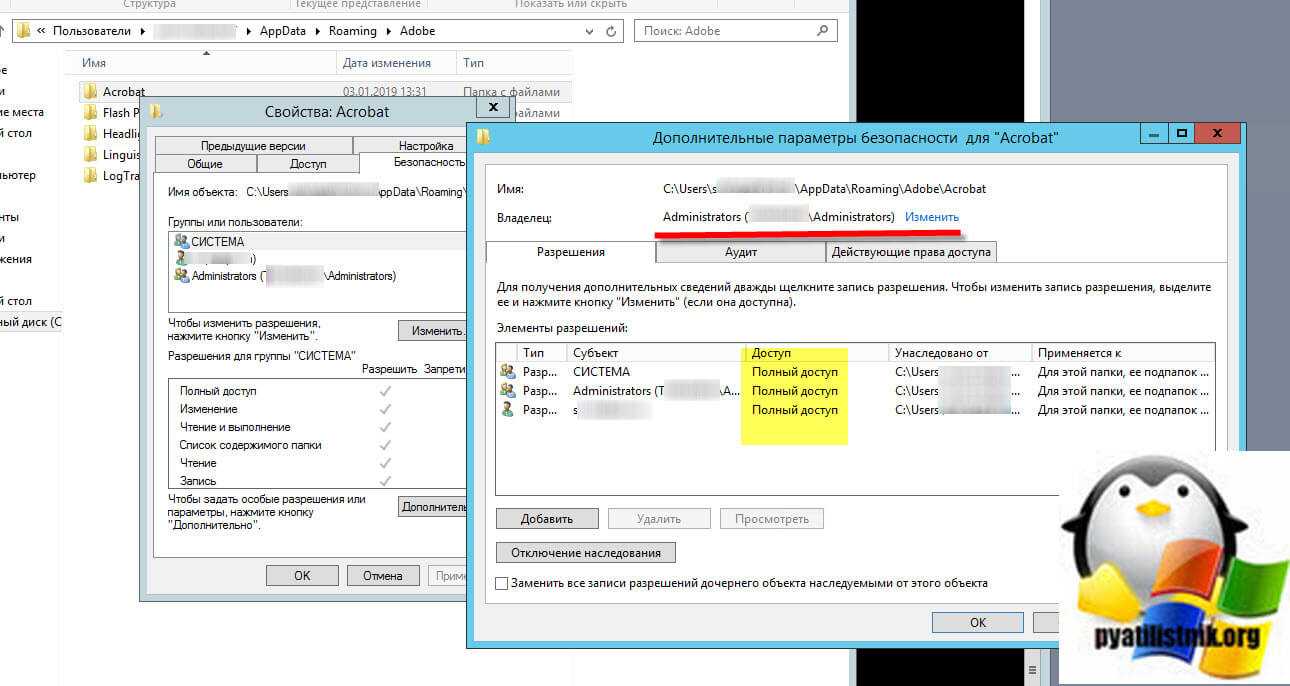 Посмотрите кто является владельцем папки и есть ли у вас вообще полные права на нее. В моем примере, папка Adobe принадлежит администраторам сервера, это нормально, но у моей основной учетной записи полные права. Если у вас не так, то измените это.