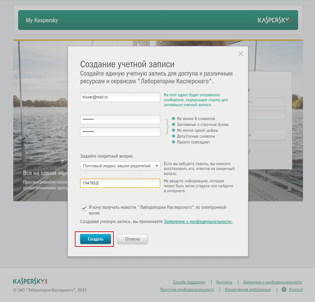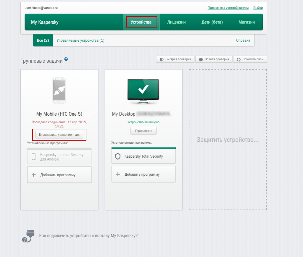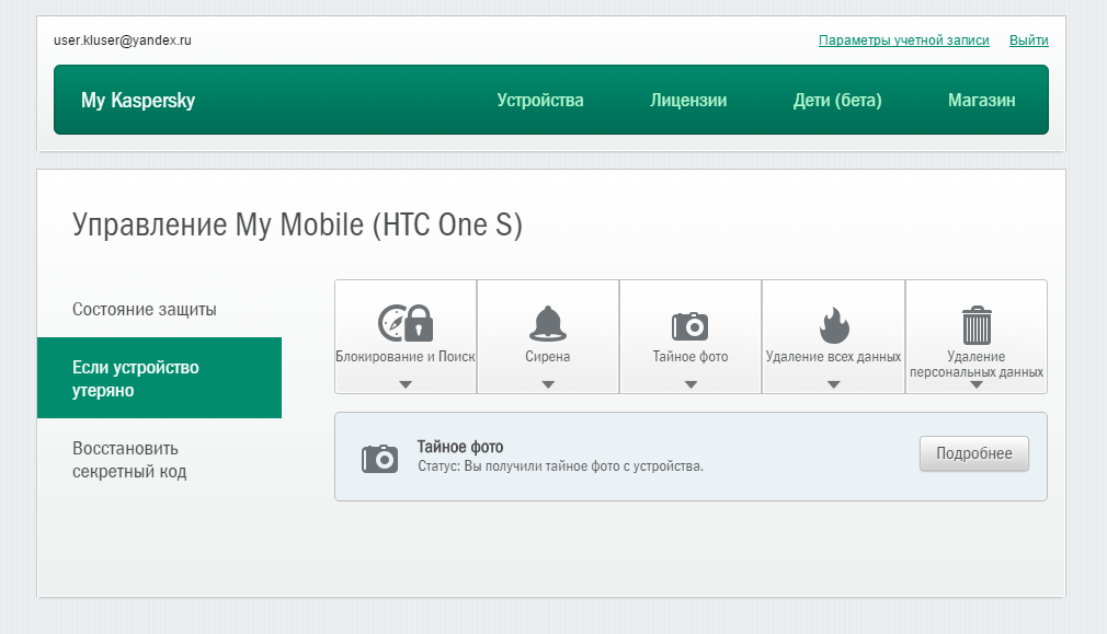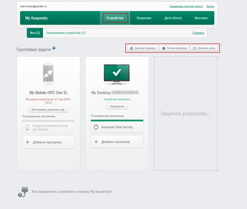 «Лаборатория Касперского» рекомендует зарегистрироваться на портале My Kaspersky, с помощью которого вы сможете управлять состоянием защиты всех ваших устройств