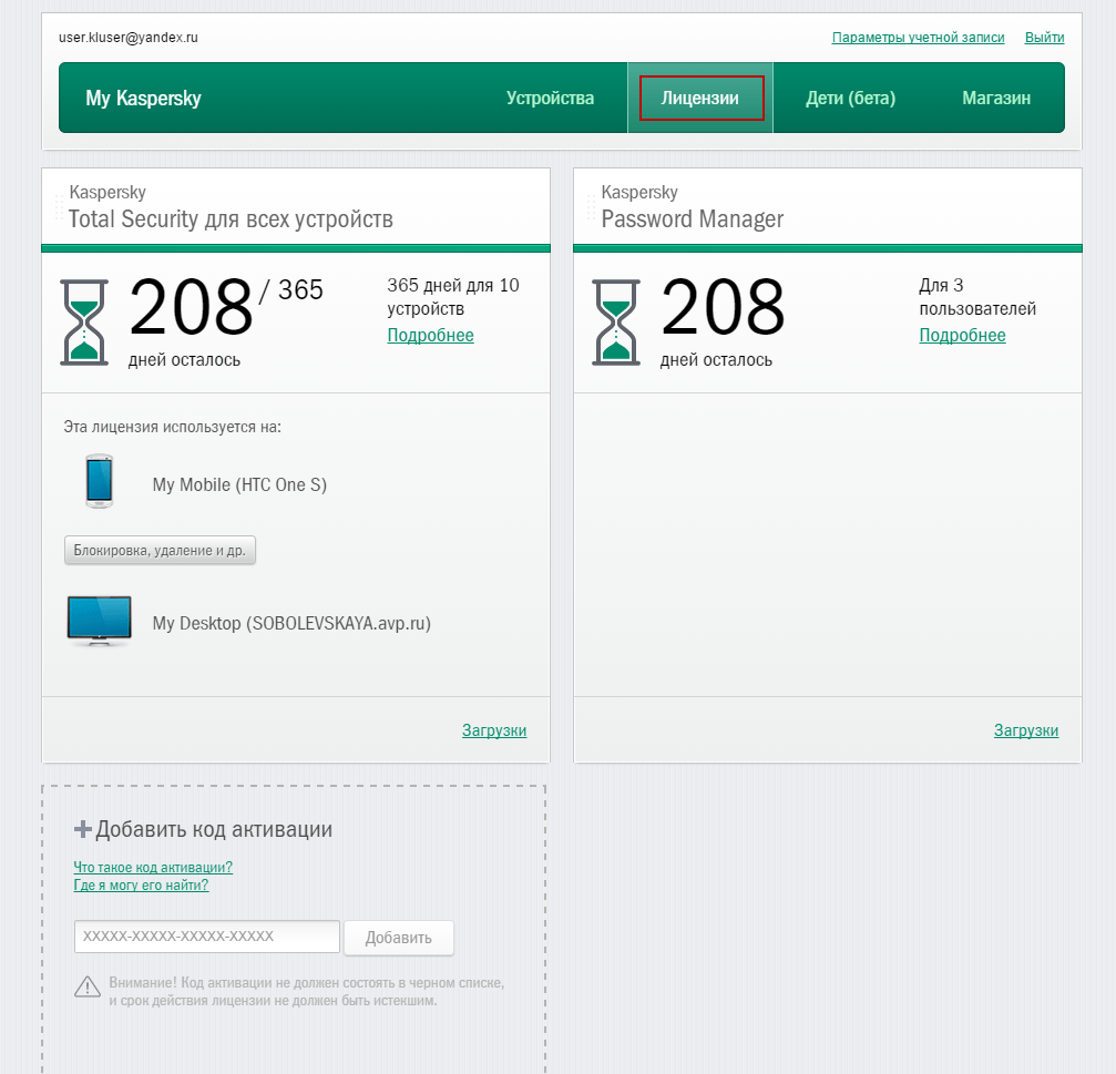 Если вы уже активировали продукт и подключили устройство к порталу, то лицензия сама добавится. На закладке Лицензии вы можете самостоятельно добавлять коды активации и привязывать их к определенному устройству.