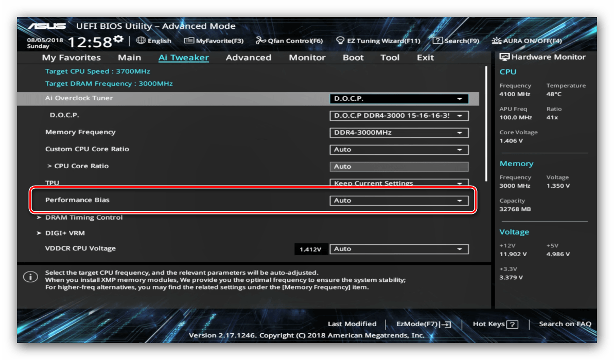 Для улучшения производительности рекомендуется установить параметр «Performance Bias» в положение «Auto».