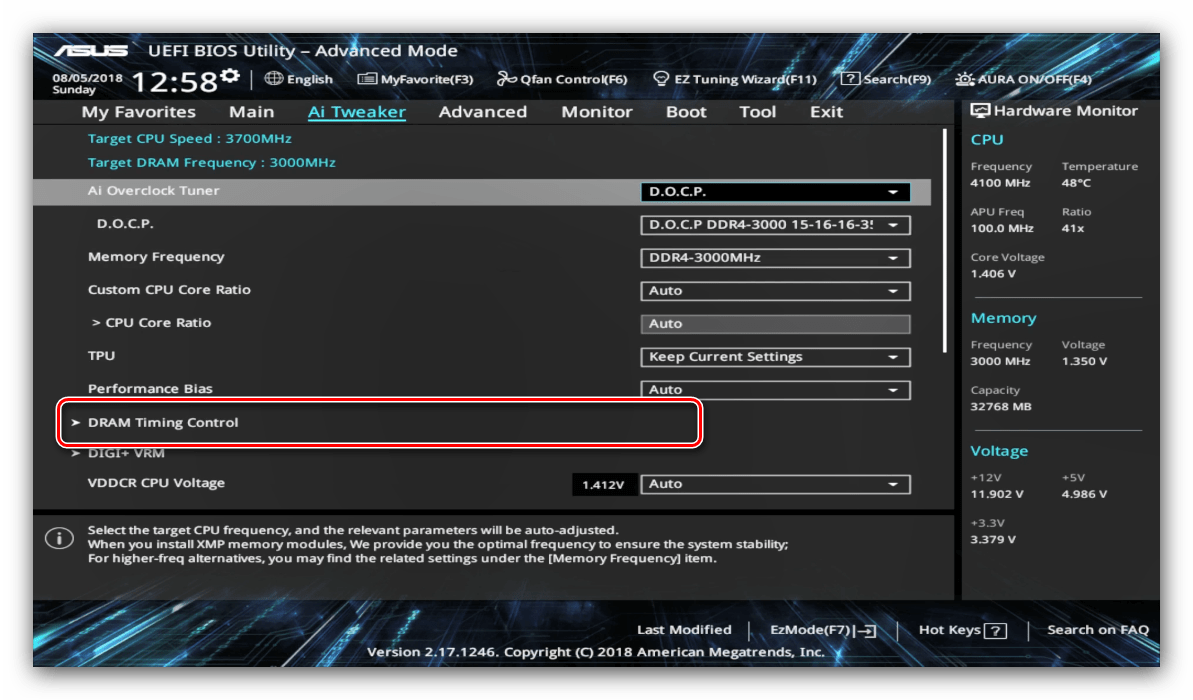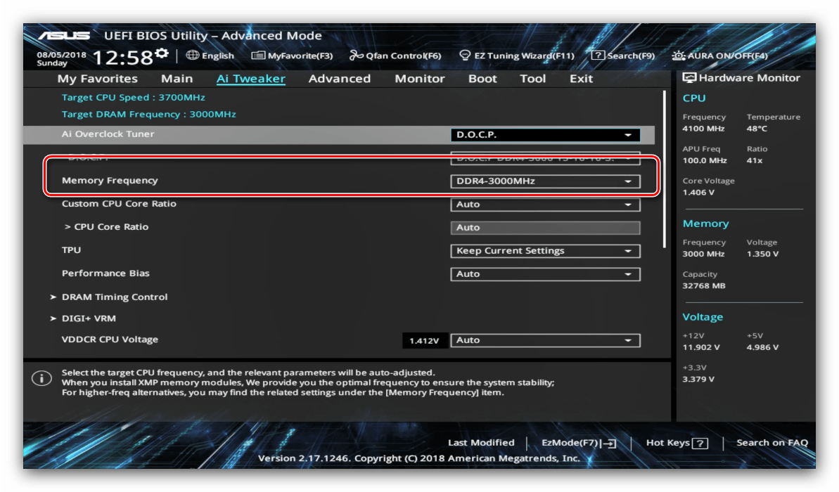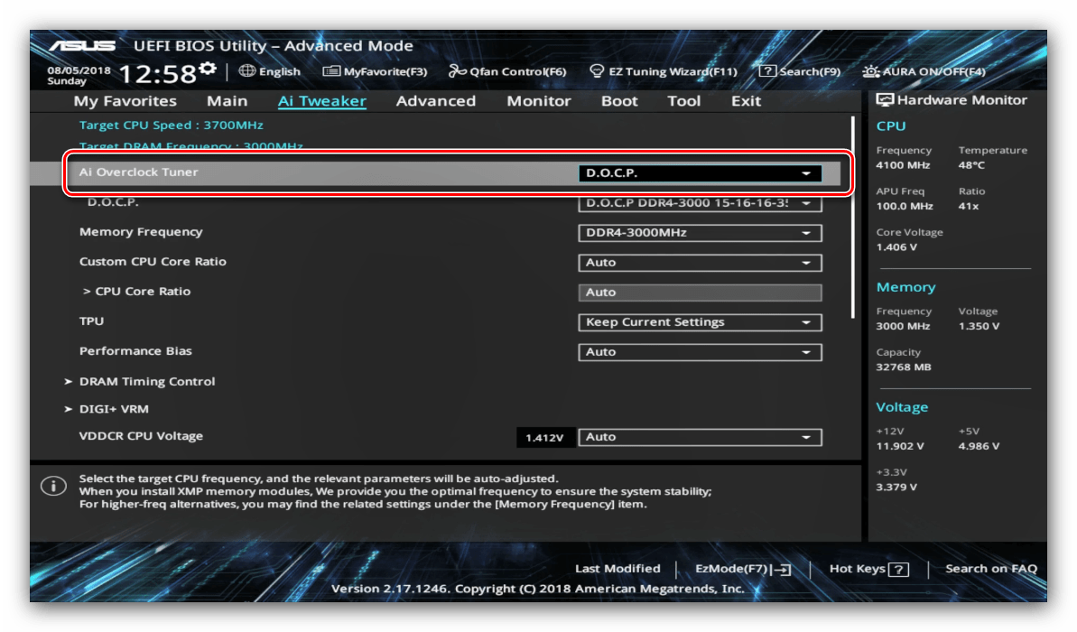 Опция «AI Overclock Tuner» переключает режимы интеллектуального разгона, при котором ПО платы само определяет подходящие частоту и вольтаж.
