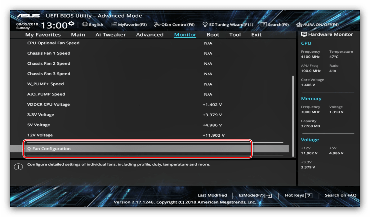 Здесь расположены данные по текущей температуре процессора и основных компонентов компьютера, а также опции управления системой вентиляторов в разделе «Q-Fan Configuration».