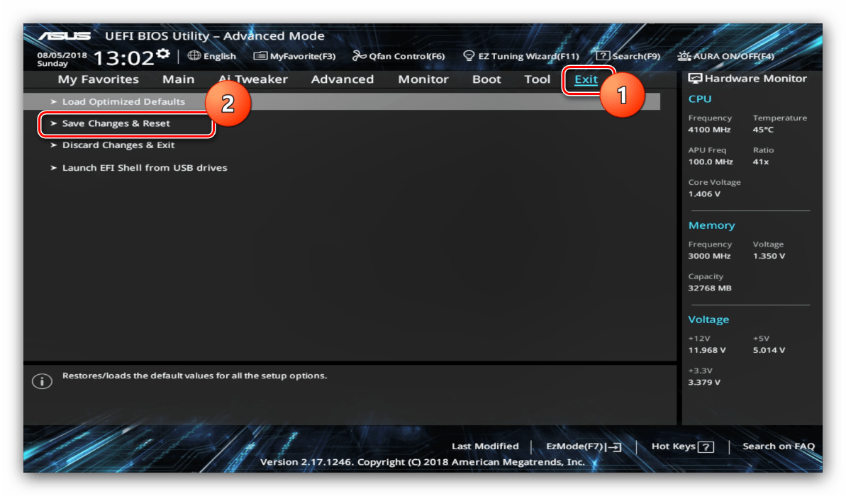 Для сохранения изменений в UEFI BIOS Utility требуется нажатие клавиши F10 на клавиатуре. В более новых вариантах UEFI следует воспользоваться вкладкой «Exit», на которой выбрать вариант «Save Changes & Reset».