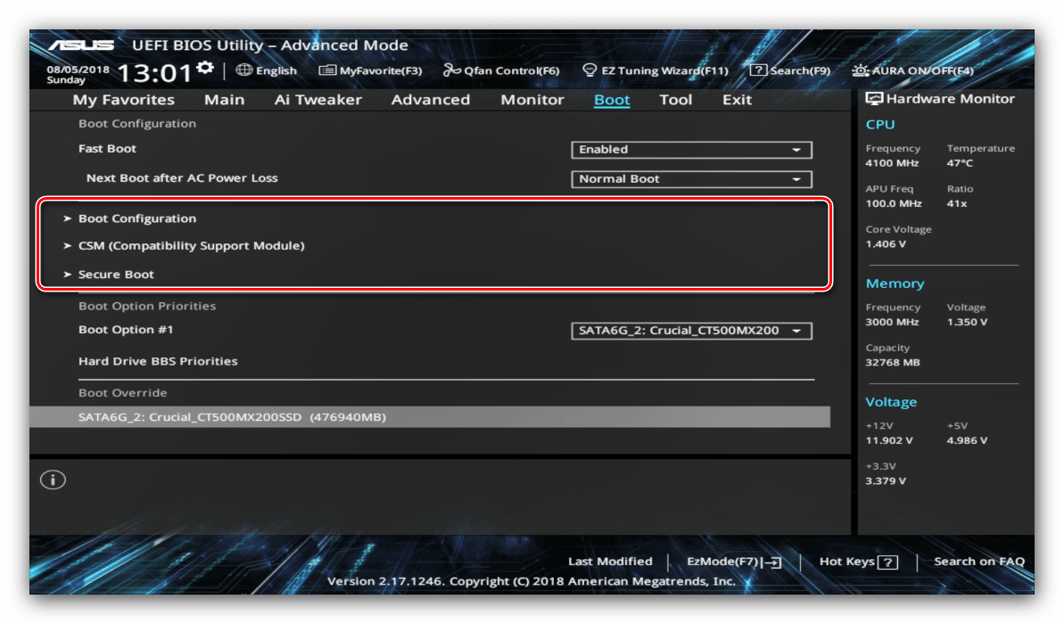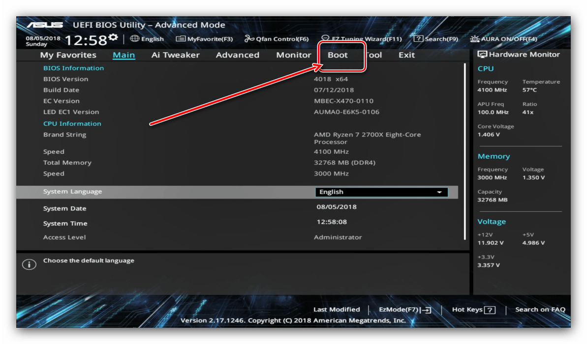- Для настройки загрузки перейдите на вкладку «Boot».
