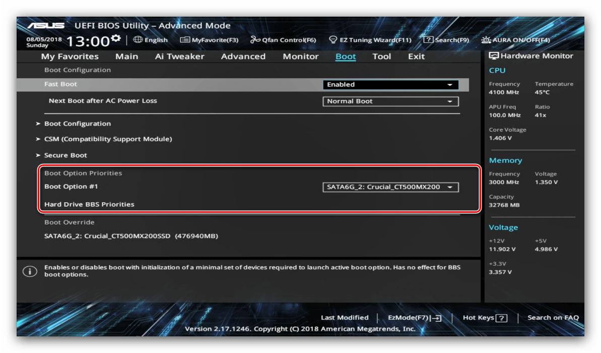 Найдите блок под названием «Boot Option Priorities». В нём расположены все распознанные БИОСом накопители, с которых поддерживается загрузка. Пункт с названием «Boot Option #1» обозначает первичный накопитель – как правило, это должен быть HDD или SSD.