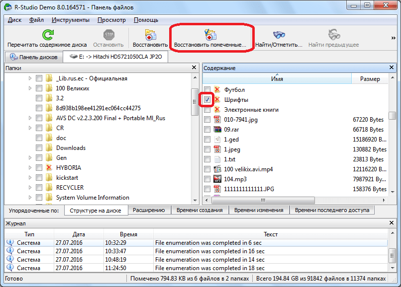 Для того, чтобы восстановить нужную папку или файл, помечаем его галочкой, и жмем кнопку на панели инструментов «Восстановить помеченные».