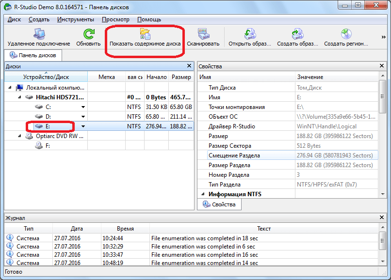 После завершения сканирования вы увидите все доступные файловые системы. Выберите одну из них и нажмите «Показать содержимое диска». Кстати, та же опция доступна из контекстного меню: