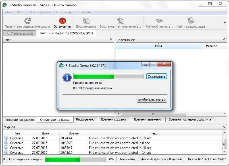Если вы хотите восстановить все данные, нужно просканировать нужный раздел, чтобы обнаружить все файловые системы, которые там были и с которыми может работать утилита. Для этого выберите нужный раздел и нажмите кнопку «Сканировать». Этот процесс может занять длительное время, прогресс будет отображаться в правой части рабочей области: