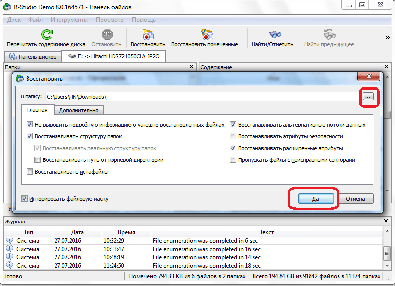 Здесь останется указать место, в которое будут сохранены данные. Это не должен быть тот же накопитель, с которого производится восстановление. Здесь же можно задать восстановление структуры, а также отказаться от восстановления поврежденных элементов. Останется нажать ок и дождаться окончания работы.
