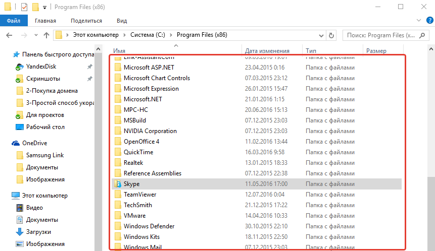 Просматривая список папок, вам нужно найти ту, которая называется также (или примерно также) как программа, которую вы хотели удалить и у вас это не получалось. Например, у вас не удалялся Skype обычным образом из-за какой-то ошибки. В папке C:Program Files (x86) видим папку с именем «Skype». Вот её и пытаемся удалить вручную. Должно получиться.
