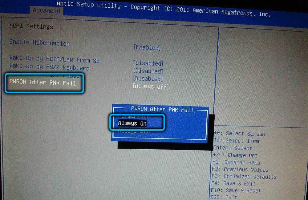 Вариант Power-On может иметь и другие названия: Always On, On или Enabled. Если установлен данный вариант, то при отключении питания и последующей подаче питания на блок питания компьютера компьютер автоматически включается, вне зависимости от того, был ли до отключения питания ПК выключен или нет.