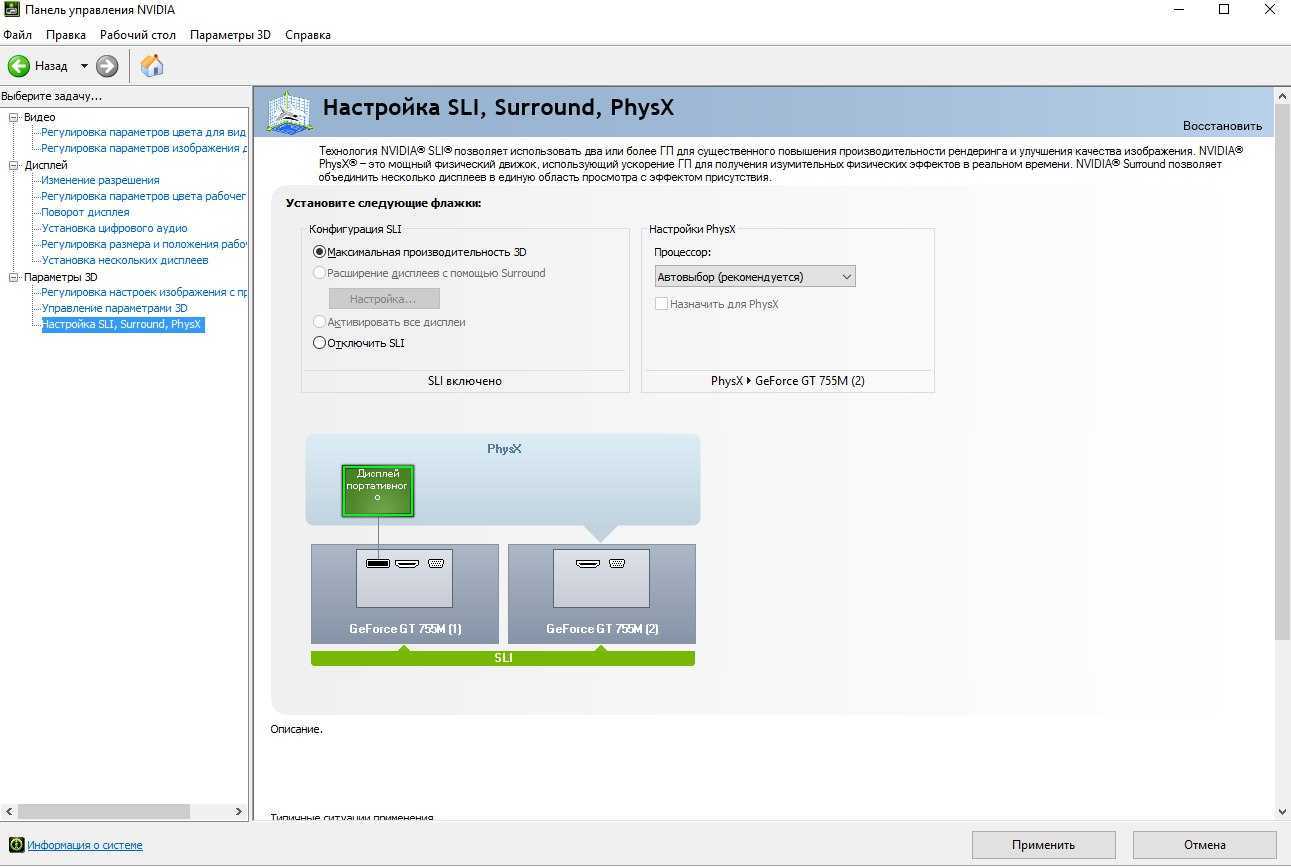 - Третья проблема решается довольно просто, но появляется каждый раз, как мы обновили драйвер и для её исправления нужно несколько кликов. Поскольку мы еще не выходили с панели управления Nvidia нужно кликнуть на вкладку «Настройка SLI, Surround, PhysX» и нажать на «Обновить параметры» затем на кнопку «Применить» и данная проблема будет решена.