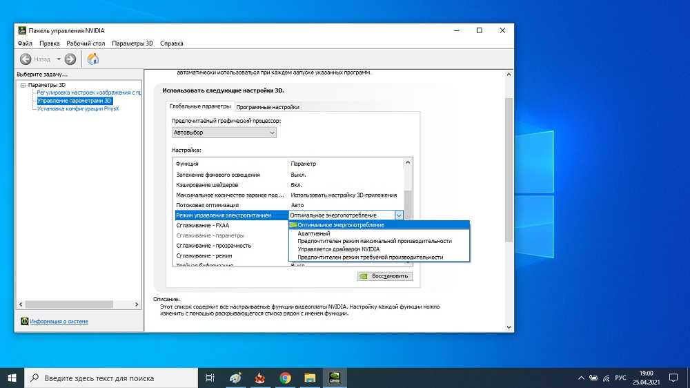 Но нужно чётко понимать, что управление электропитанием NVidia относится только к видеокарте. Если вы хотите управлять ещё и ЦП, то для этого нужно использовать настройки самой Windows.