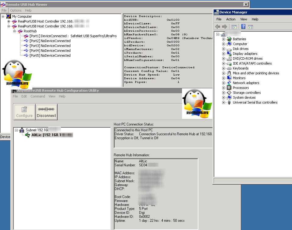 Если у вас все хорошо по тестам, но сервер все равно отказывается видеть аппаратный ключ, то тут уже придется переустанавливать драйвера и играться с версиями, как клиентов от USB коммутатора, так и с драйверами от самого производителя токенов.
