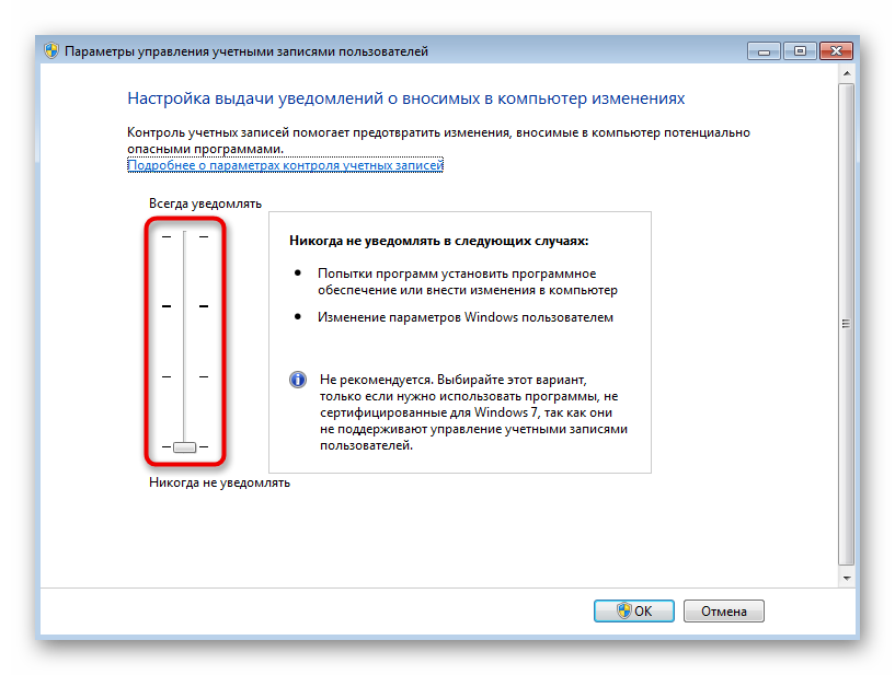 Передвиньте ползунок вниз, чтобы он остался в значении «Никогда не уведомлять». После этого отправьте ПК на перезагрузку и проверьте, была ли устранена проблема.