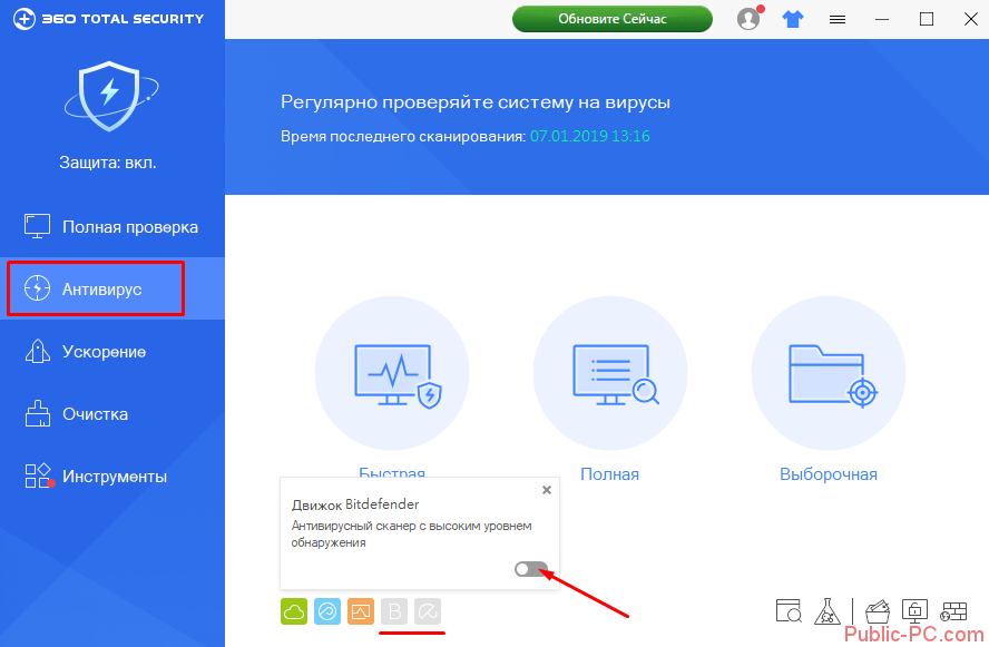 Для того, чтобы включить по умолчанию не работающие движки, необходимо перейти во вкладку «Антивирус», навести курсор на иконку и перевести ползунок в рабочее состояние: