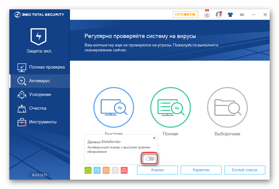 Рис. 3. Ползунок включения/выключения антивирусного движка
