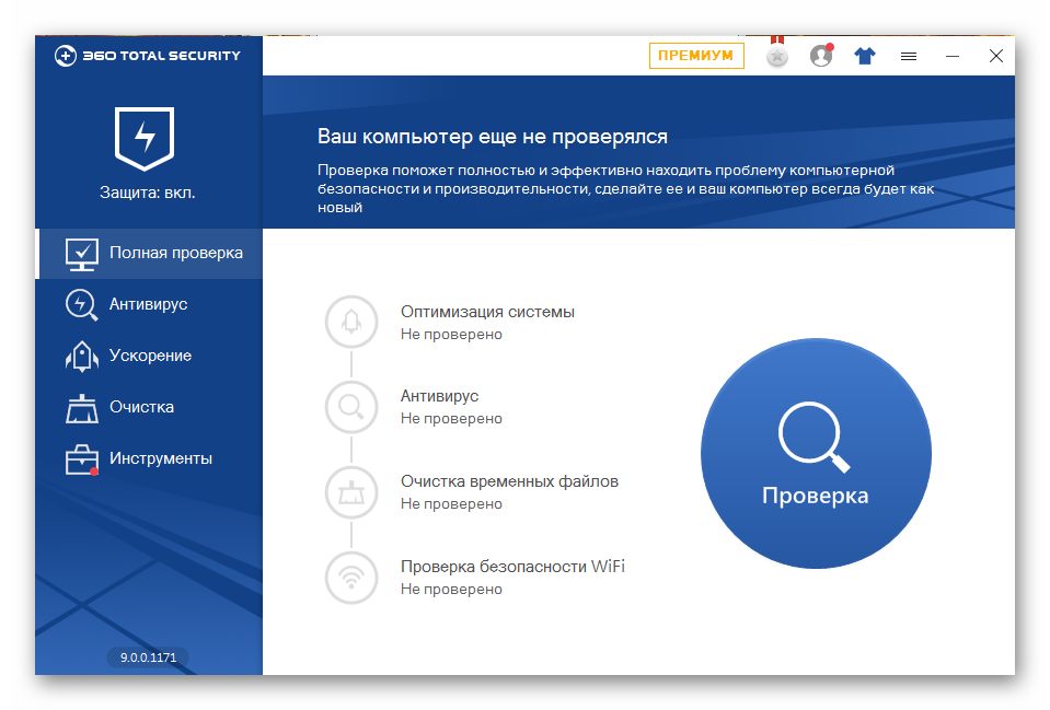 Изучим немного 360 Total Security внешне. На вкладке Полная проверка есть одна громадная кнопка — Проверка, ее нажимаете и антивирус соответственно начинает проверять комп: