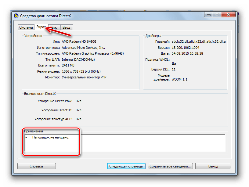 Когда наблюдаются явные неполадки даже без проведения стресс-теста, то можно проверить состояние видеокарты через DxDiag.