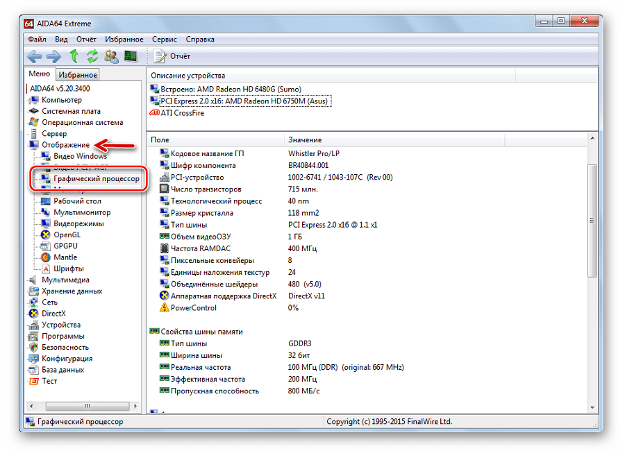 Получить исчерпывающую информацию о параметрах видеокарты можно с помощью программы AIDA64. В ней нужно открыть раздел «Отображение» и выбрать «Графический процессор».