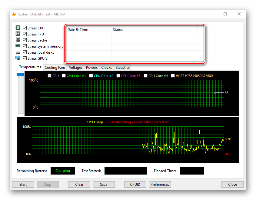 Под словом Stress здесь понимается, что на определенные компоненты системы, которые мы отмечаем галочкой, будет оказываться нагрузка определенной степени, начиная от простой такой как обычная симуляция работы (например, работа процессора как при проведении расчета сложной операции) и заканчивая такими внештатными ситуациями как снижение скорости работы вентиляторов охлаждения т. е. кулеров, что является частой ситуацией скажем так в летнюю жару.