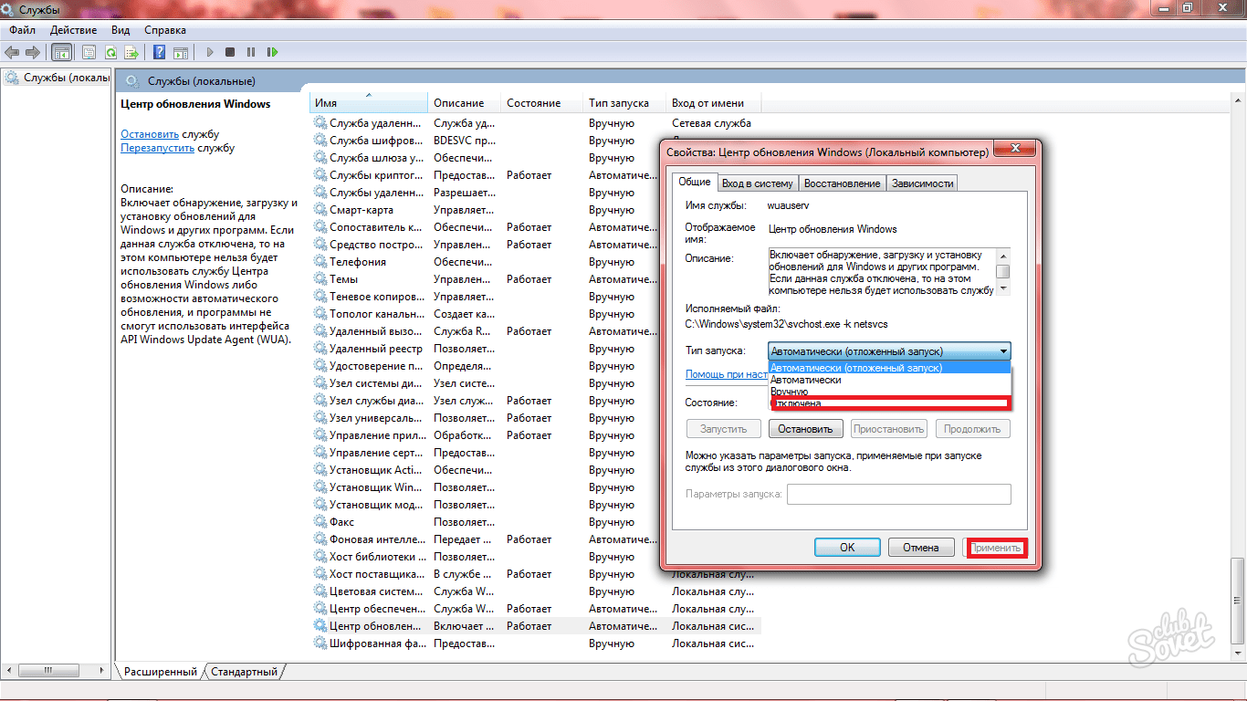 Из выпадающего списка во вкладке “Общие” выберите “Отключена”. Вас осталось только кликнуть “Применить”. Этот метод отключает обновления Windows и проверку лицензии, таким образом, сообщение пропадет с экрана.