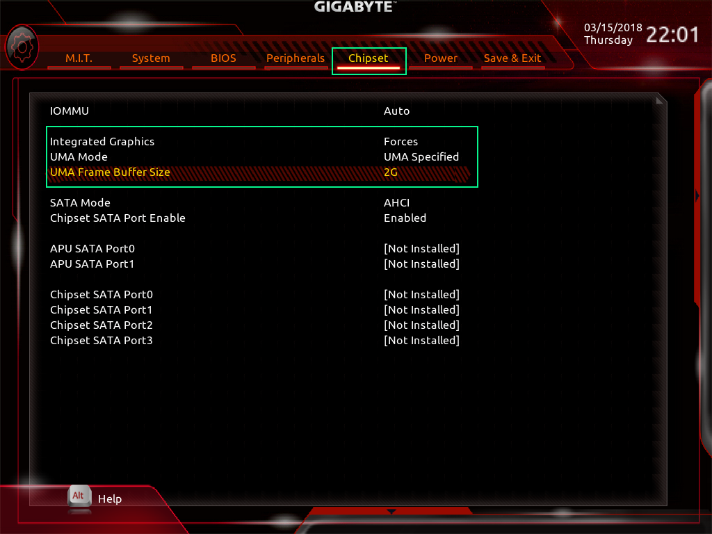 - На Gigabyte нужно зайти на вкладку Chipset и найти строку Integrated Graphics. Далее выберите параметр Forces. Появится строка UMA Mode, которую нужно выставить на UMA Specified. Затем в строке UMA Frame Buffer Size выбрать нужный параметр.