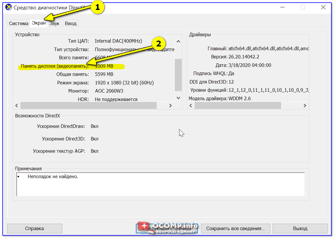 Далее откроется средство диагностики DirectX — во вкладке «Экран» среди прочих характеристик устройства вы найдете размер видеопамяти ().