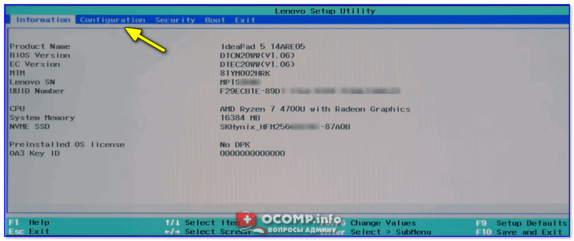 Далее нужно перейти в раздел «Configuration» (в некоторых BIOS за это отвечает раздел «Advanced» ).