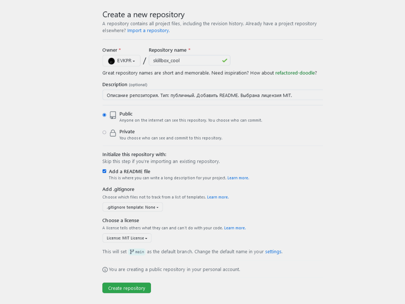 Шаг 1. Создание GitHub-репозитория в веб-версииСкриншот: Skillbox Media