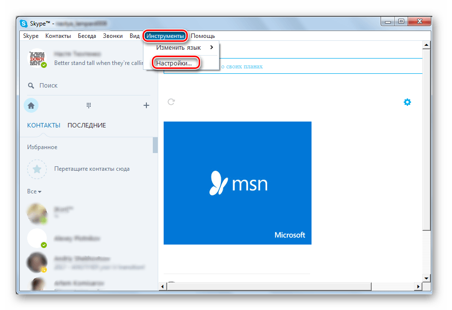 Если ни один из вышеописанных путей решения не выявил проблемы, и при этом звук не воспроизводится исключительно в Скайпе, то нужно заглянуть в его настройки. Переходим последовательно по пунктам меню «Инструменты» и «Настройки».