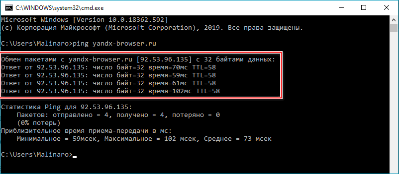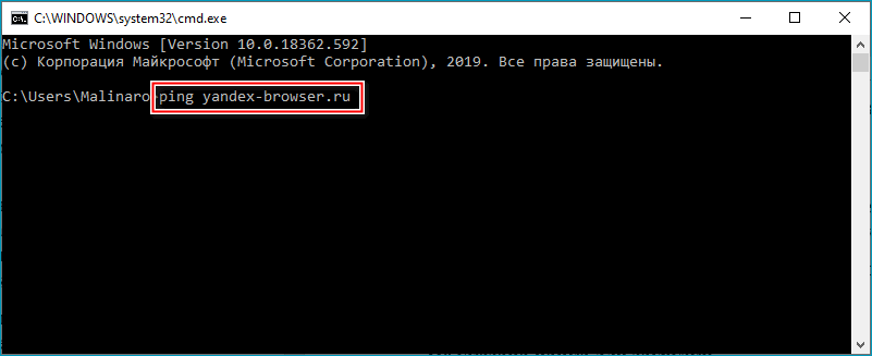 - В командном окне введите команду для проверки задержки между используемым компьютером и сайтом, с которого не можете скачать файл: ping yandx-browser.ru, где yandx-browser.ru — имя сайта, где прерывается загрузка файлов в браузере Яндекс.