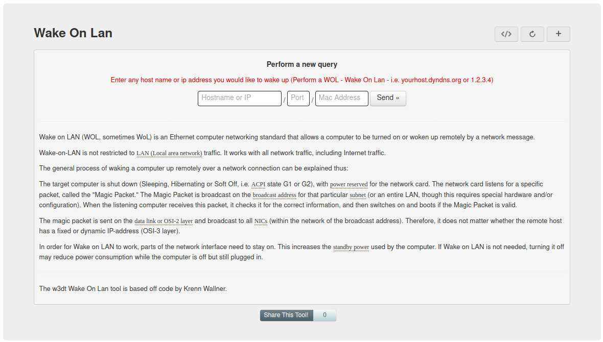 Если вы хотите быстро и без лишней волокиты включить свой компьютер с помощью технологии Wake-On-Lan, то можно воспользоваться онлайн сервисами, которые позволяют задать IP адрес (обычно это будет адрес вашего роутера, на котором уже был предварительно настроен проброс портов для функционирования технологии WoL, как описано в нашей статье: Настройка Wake-On-LAN в роутере), а также нужный MAC адрес, чтобы сформировать Magic Packet, который должен включить компьютер.