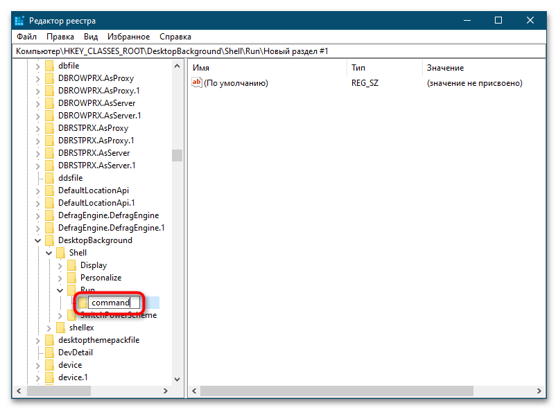 - Запустив «Редактор реестра», разверните ветку . Последний подраздел может содержать несколько вложенных каталогов, в том числе созданных прописавшимися в контекстное меню «Рабочего стола» сторонними программами. Как правило, название таких каталогов соответствует названию создавшей их программы.