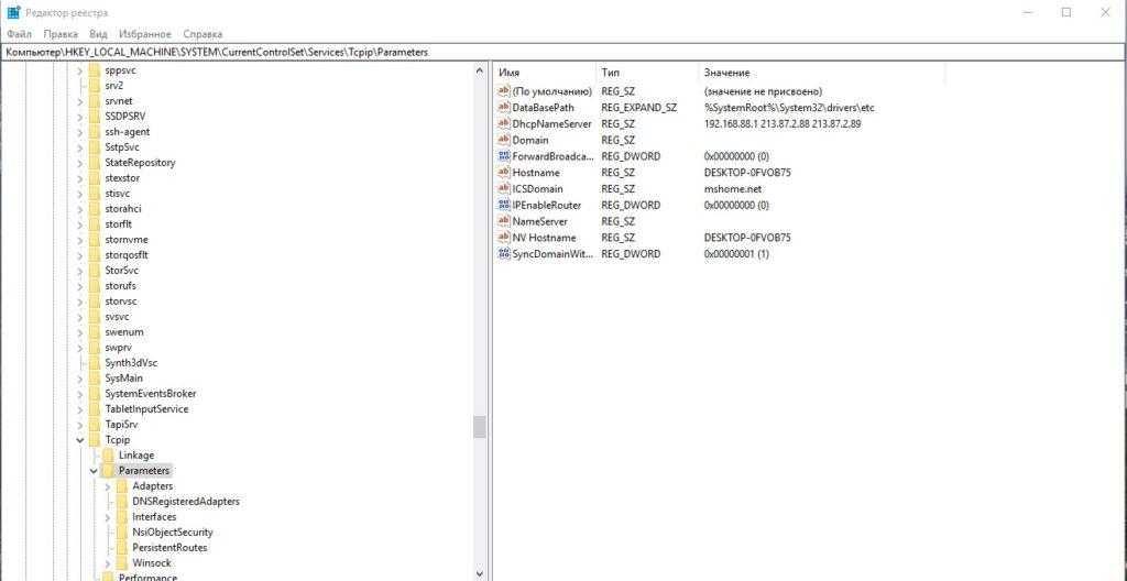 - Через него находим папку, расположенную по следующему адресу: HKEY_LOCAL_MACHINE\SYSTEM\CurrentControlSet\ Services\Tcpip\Parameters\.