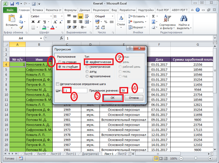 Открывается окно «Прогрессия». В параметре «Расположение» нужно установить переключатель в позицию «По столбцам». Переключатель параметра «Тип» должен находиться в позиции «Арифметическая». В поле «Шаг» нужно установить число «1», если там установлено другое. Обязательно заполните поле «Предельное значение». Тут следует указать количество строк, которые нужно пронумеровать. Если данный параметр не заполнен, автоматическая нумерация произведена не будет. В конце следует нажать на кнопку «OK».