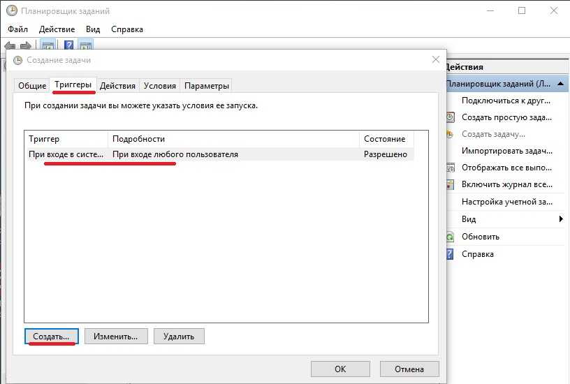 Далее сначала нужно открыть вкладку «Триггеры», кликнуть по кнопке «Создать» и назначить задачу (например, «При входе в систему»). Не забудьте поставить задачу для выполнения любого пользователя (см. скриншот ниже ).