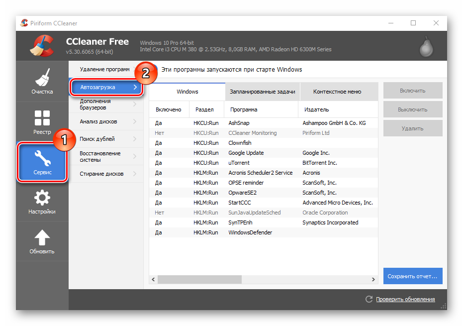 2. CCleanerЭтот поистине многофункицональный комбаин очень часто можно встретить на компьютерах и ноутбуках, применяемые преимущественно для чистки реестра. Но не все знают, что ССКлинер умеет работать с автозагрузкой — соответствующий пункт есть в разделе «Сервис».