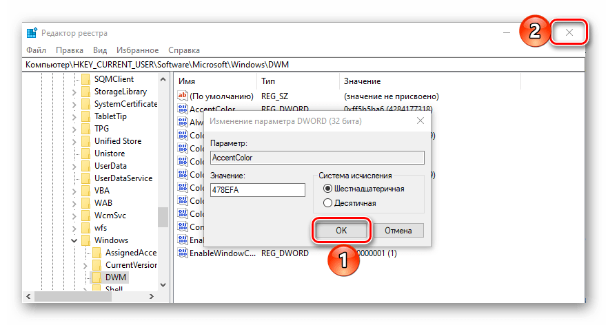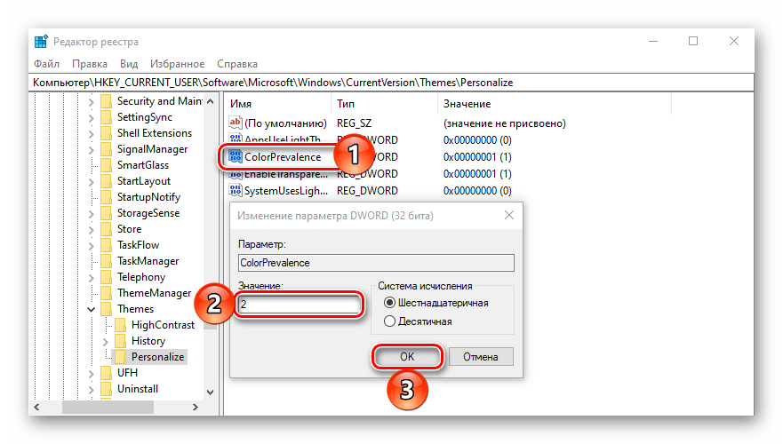 Если потребуется откатить изменения, выполненные на втором шаге, просто измените значение параметра ColorPrevalence на то, которое для него было установлено изначально – 0 или 1.