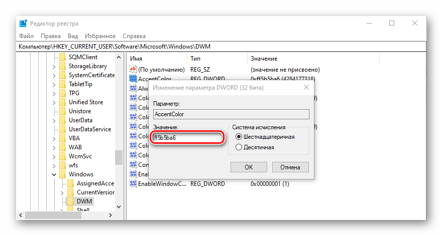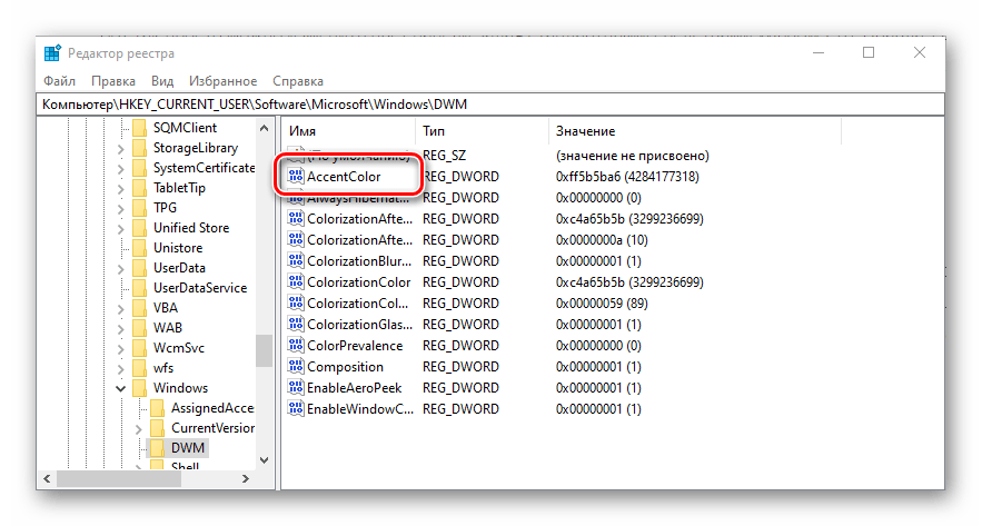 Обратите внимание на параметр AccentColor (DWORD32), кликните по нему дважды.