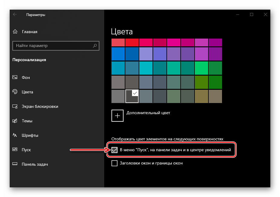 Показывать акцентный цвет в меню «Пуск» и на панели задач